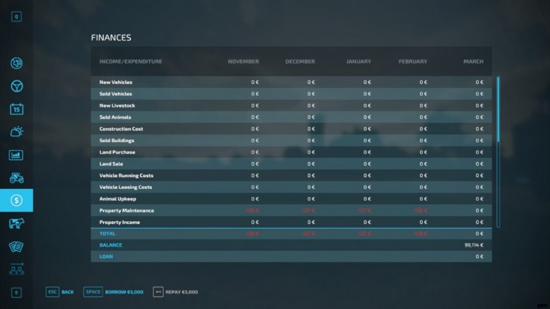 - 財務画面 すべての財務活動を追跡するのに役立ちます。車両の購入、リース、販売から動物、建物、メンテナンスなど。銀行からお金を借りて、ここで返済することもできます。