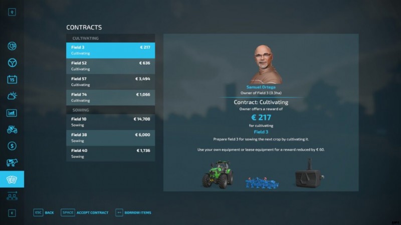 - 契約画面 利用可能なすべての契約を一覧表示します。所有している場合やリースしたい場合は、自分の機械を使用して受け入れるか、請負業者から必要なすべてのアイテムを借りることができます。 「アイテムを借りる」をクリックして、借りたマシンとの契約を開始します。