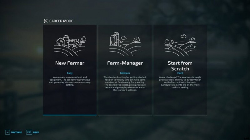 これは明らかです。ゲームを「New Farmer」モードで始めましょう。つまり、いくつかの畑と建物を含む農場、機械の選択、および開始するのに十分な銀行口座のお金から始めます。