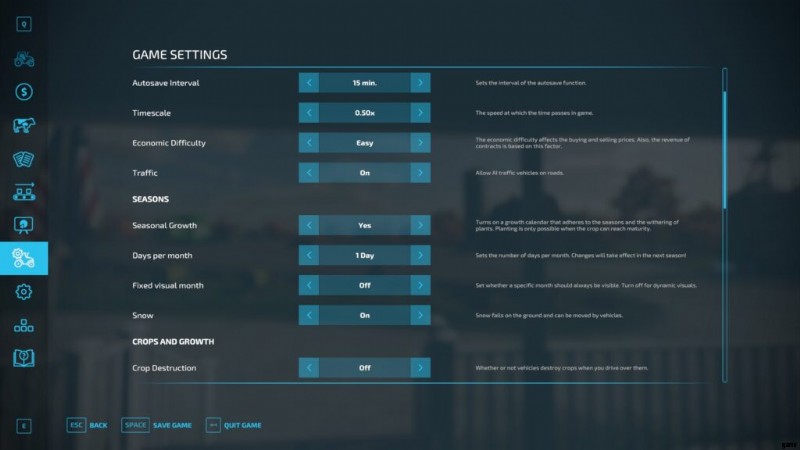 - 季節の成長 作物カレンダーに従って植えて収穫する必要があります。収穫のスピードが遅いと、作物が台無しになる危険があります。このオプションは柔軟性を制限しますが、リアリズムを向上させます。ファーミング シミュレーターを初めて使用する場合は、季節の成長を無効にすることから始めることをお勧めします。