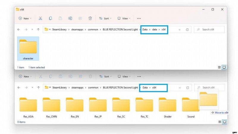 - 「BLUE REFLECTION Second Light\DATA\data\x64」の否定新しいキャラクター フォルダを「BLUE REFLECTION Second Light\DATA\x64」にコピーまたは移動