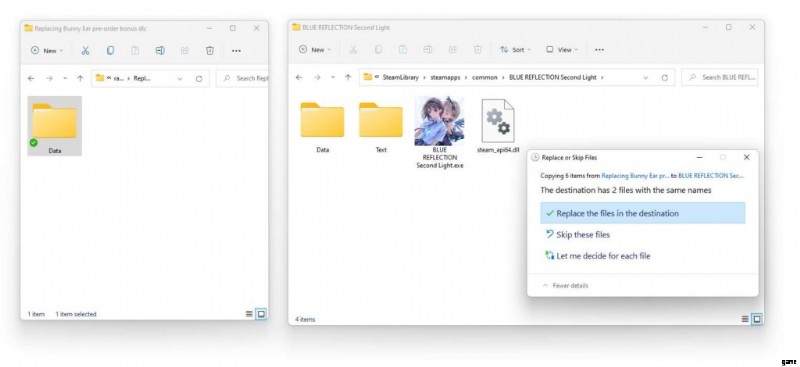 - DATA フォルダーをゲームのルート フォルダーにコピーし、プロンプトが表示されたら置き換えます。これら 2 つのファイルを置き換えるように求められない場合は、正しいファイル構造を設定していないことを意味します。ステップ 6 に戻ってください。
