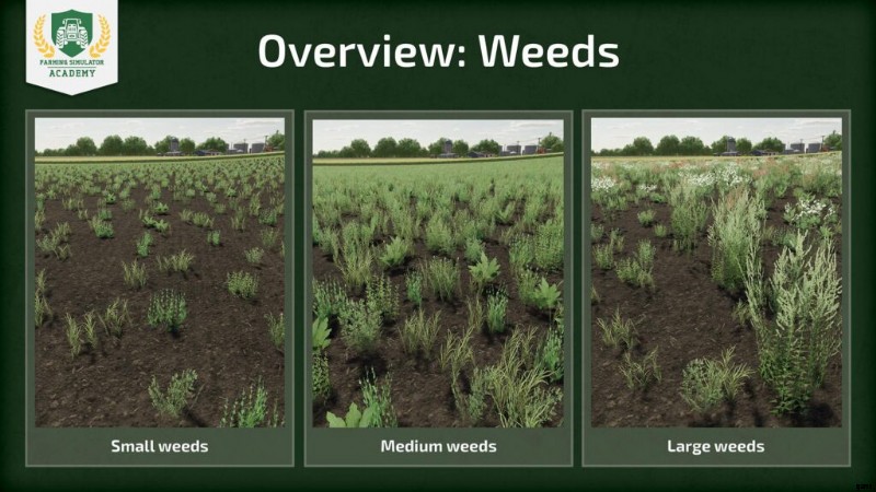 Farming Simulator では、雑草は畑の状態の一種です。雑草の成長には、小、中、大のさまざまな段階があります。サイズに応じて、さまざまな機械が使用されます。詳細については以下をご覧ください。雑草は、収穫の準備が整う前にいつでも取り除くことができます。