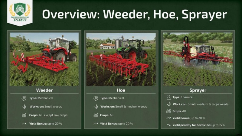 - ヒント!フィールド情報ボックスには、雑草がどの成長段階にあるか、それらを取り除くために必要な機械が表示されます。