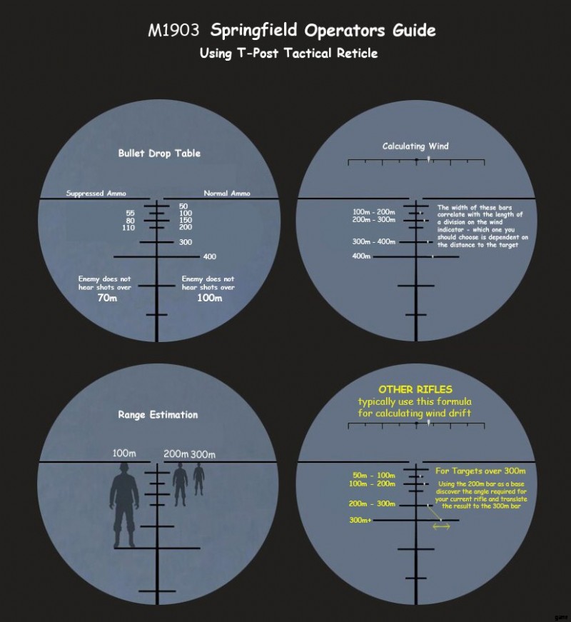 M1903 スプリングフィールド ライフルと T-Post タクティカル レチクルを備えた、わかりやすい照準ガイド。
