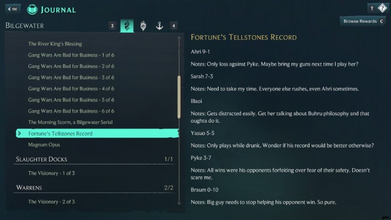 私は日誌エントリ「フォーチュンのテルストーン記録」について話し合っています。この特定のエントリは、ビルジウォーターのジャグド フック ウェアハウスにあります。それ以上、ネタバレはありません。
