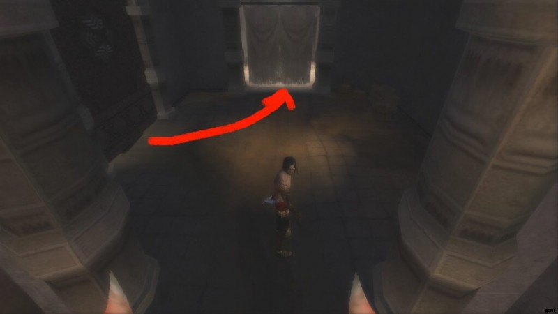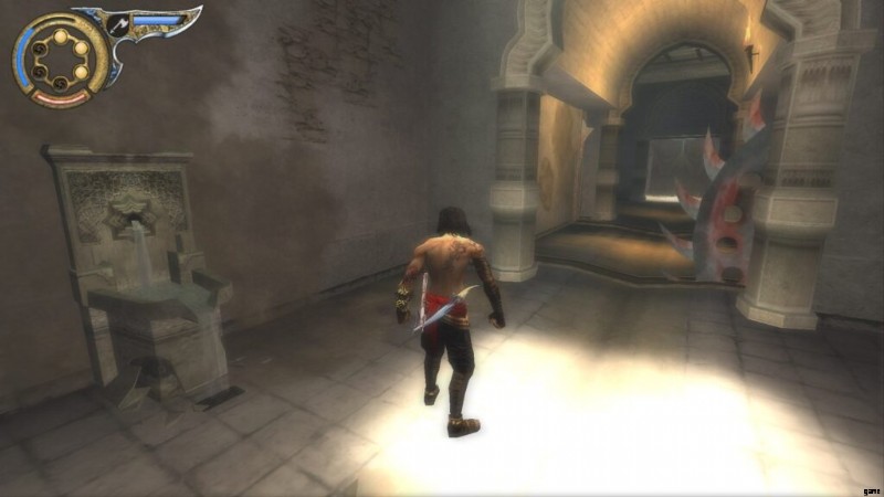 初めての闇の王子としてのプレイを終え、再び通常の王子になったら、2 つの出入口の近くまで登ります。上から光が差し込む暗い部屋で、光を怖がる敵と戦った直後です。そこにドアを開けるダガースイッチがあります。この扉をくぐると、道が2つに分かれます。 1 つは左に、もう 1 つは右に。左の道は生命のアップグレードにつながり、刃のある右の道はセーブ ファウンテンと次のエリアにつながります。
