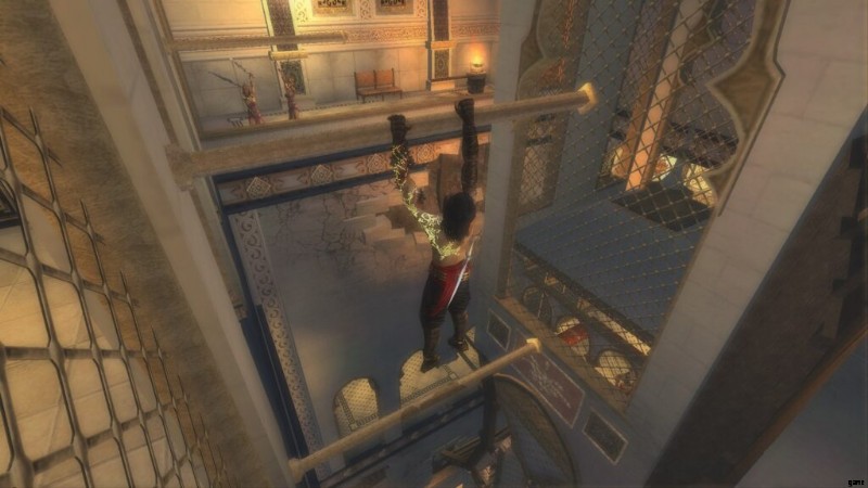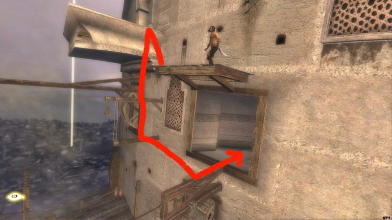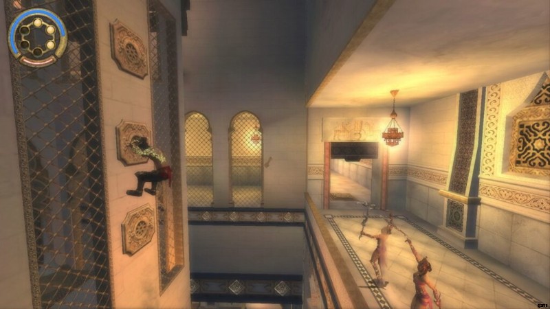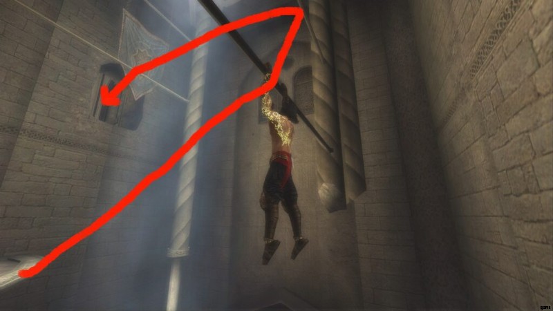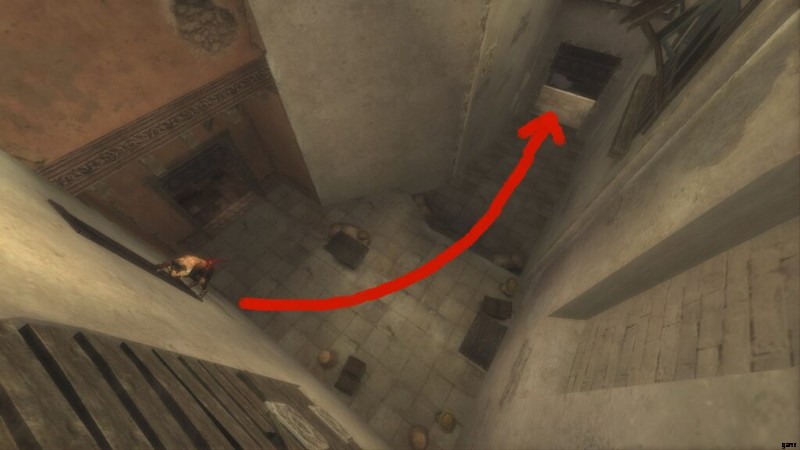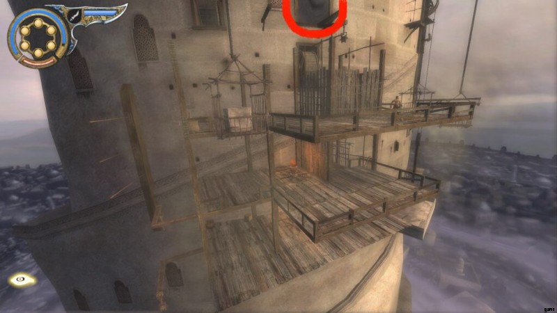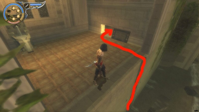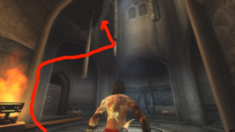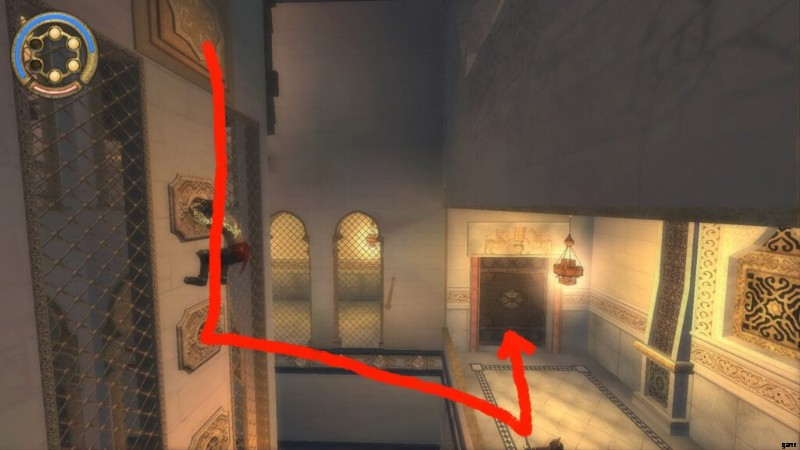これは、ダガースイッチのあるドアのすぐ前にある「テンプル」と呼ばれる保存噴水の直後です。通り抜けてバルコニーに出ると、宰相がバビロンの警備員の1人を切り倒しているのが見え、あなたは闇の王子になります.それからあなたは戦って部屋に飛び込み、そこで宰相が去るのを見ます。部屋が水で満たされたので、あなたは再び通常の王子になります.アップグレードする部屋です。レバーを回して水を切り、ポールを登ります。揺れるポールに乗るまで、壁に沿って走ります。