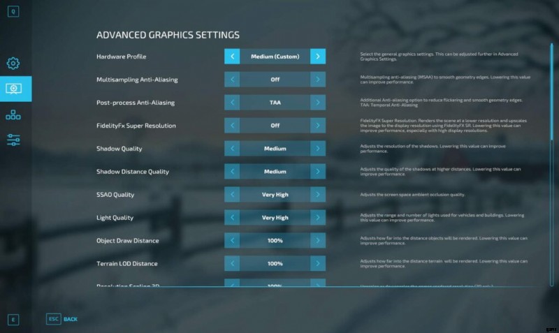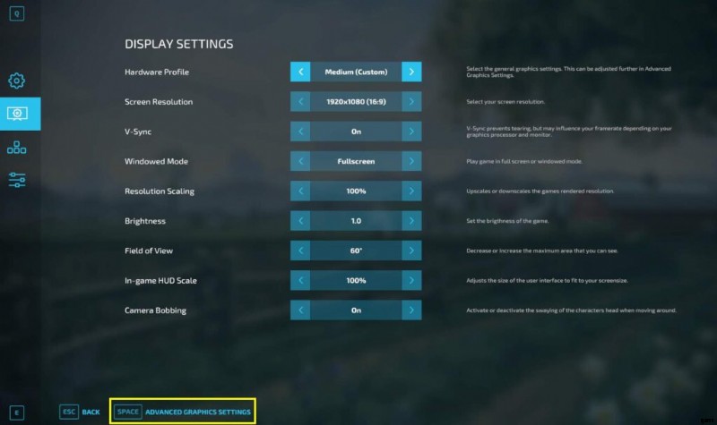 Space キーを押すか、[高度なグラフィック設定] をクリックします。
