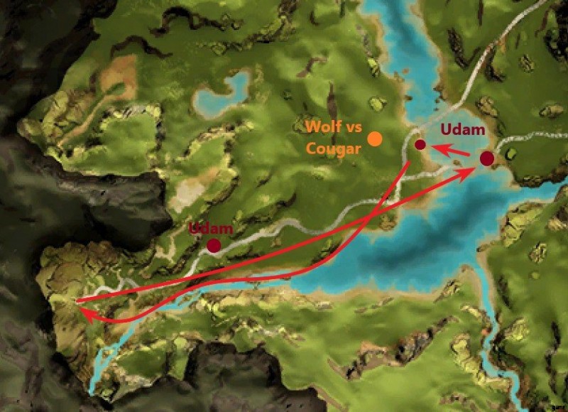 いずれかの体に緑の葉がある可能性があり、その場合は村にまっすぐ戻ることができます.それ以外の場合は、川の村側に戻り、最後のウダムを殺さずにグリーンリーフを後ろに連れて行きます.避けたいオオカミの先に、ジャガーがオオカミと戦っています。
