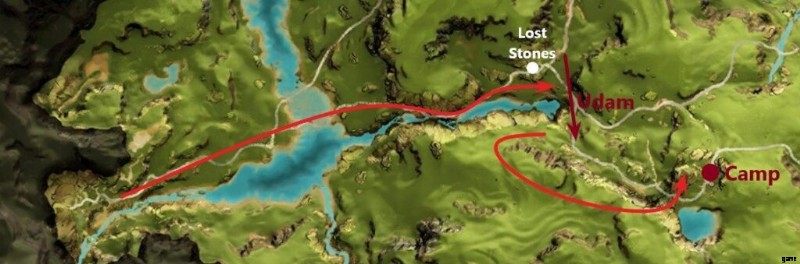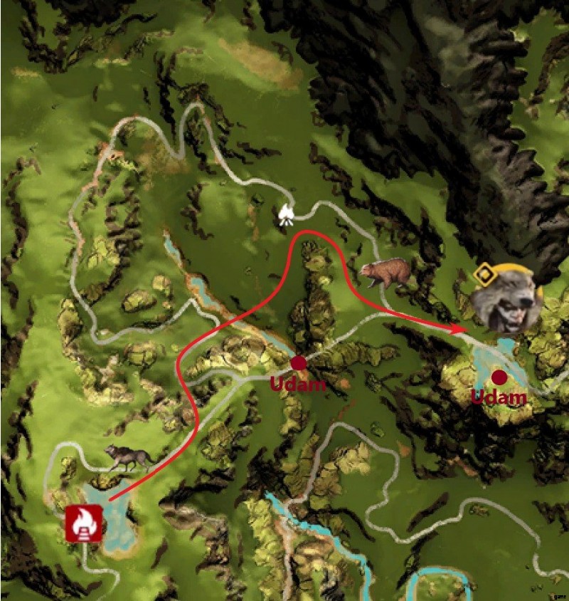 Tensay の洞窟に近づくと、Stone Fingers でキャンプしている 3 つの Udam に出くわすことがあります。彼らがそこにいない場合は、近くにある 2 つの Daysha の手を拾ってから入ります。Vision of Beasts の後、Tensay の洞窟から出るときは注意してください。3 つの Udam またはクマがスポーンしている可能性があります。北西への 2 番目の Tensay ミッション。