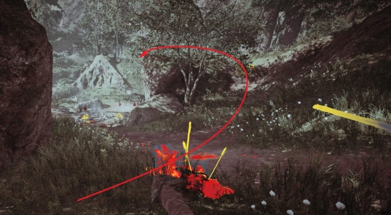 3 人のウダム ウルフ ハンターに対処することは、あなたの最初の本当の避けられない戦いです。右に疾走し、彼らの後ろを一周します。こっそりする必要はありません。ただ歩いて、彼らの真上の岩に登ってください。トリックは、ショット間で素早くすることです。最初に整列し、きれいなヘッドショットを取得するようにしてください.通常、何が起こっているのかを理解するのに 1 秒ほどかかりますが、これはもう 1 回撮影するのに十分な時間です。射手のために槍を取っておきます。