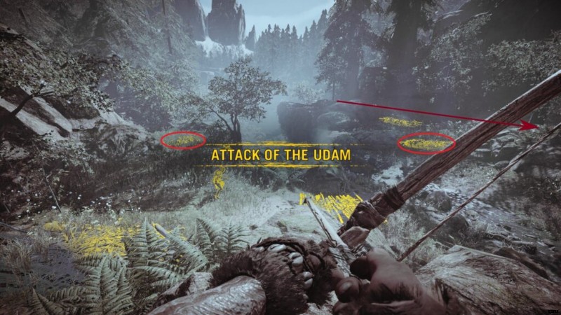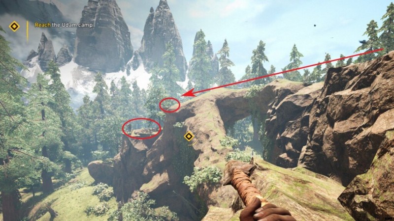 Up the hill to your right is a ridge. Circle all the way back to get on top of it (you’ll get a warning that you are leaving the mission zone). This will let you enter the camp from a perfect sniping position. If you succeeded at the Lost Stones, there should only be four Udam left to deal with, and the first one is served up on the middle ledge below you. Pick them off one at a time from this ledge, and if they notice you, climb the vine to the higher platform or hide in the bushes to finish them off.