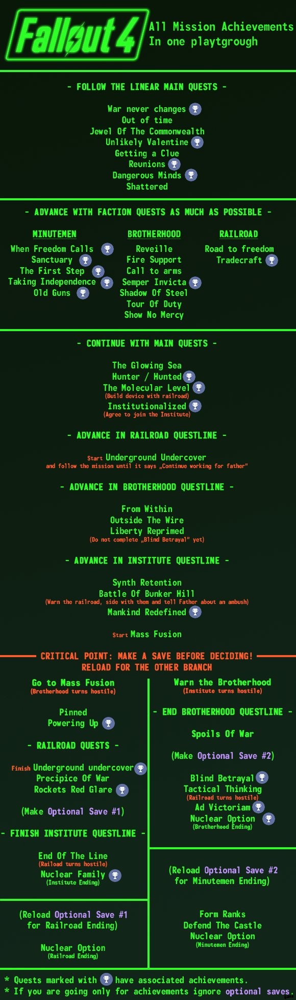 他のガイドは役に立ちますが、かなり混沌としているので、1 回のセーブ/リロードだけですべての実績を取得する方法を示す表を作成しました。私のガイドでは、Brotherhood と連携しながら「The Nuclear Option」のロックを解除する方法を示していますが、Railroad または Minutemen のエンディングをプレイしたい場合は、これらの手順から分岐するタイミングも示しています。