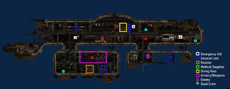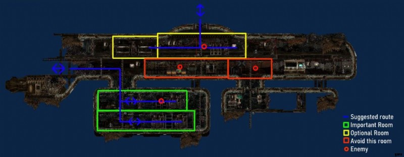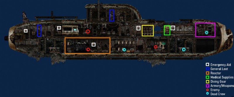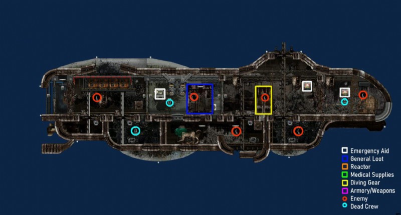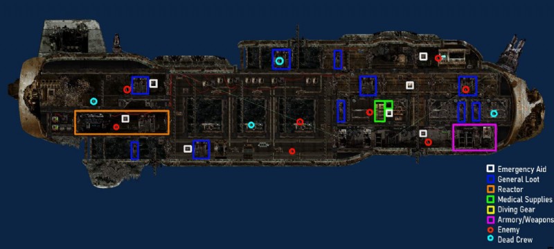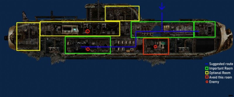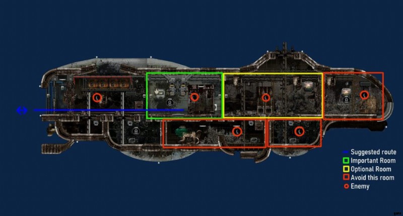 以下は、計画されたルートのガイドと、マークされた部屋と敵のスポーンの両方を備えた、各難破船を略奪する方法に関するいくつかの便利なマップです.死んだ乗組員の ID タグがあれば、いくつかのドアを開けなくても済むことに注意してください。モンスターのスポーン (赤) と死んだ乗組員 (水色) はオプションであり、一部のスポーンポイントでのみスポーンすることに注意してください。また、一部のモンスター スポーンでは、1 つではなく 2 つのモンスターがスポーンすることはめったにないことに注意してください。