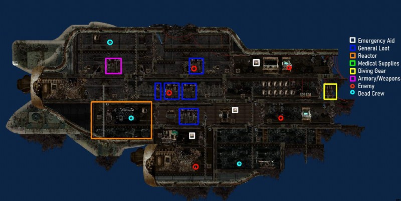 戦利品が最も多い最大の難破船ですが、略奪するのが最も危険でもあります。これには 100% 追加の O2 タンクが必要です。また、追加の弾薬と医療用品を用意することも有効です。これは、私が伝説の銃のほとんどを手に入れた難破船です.