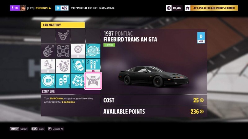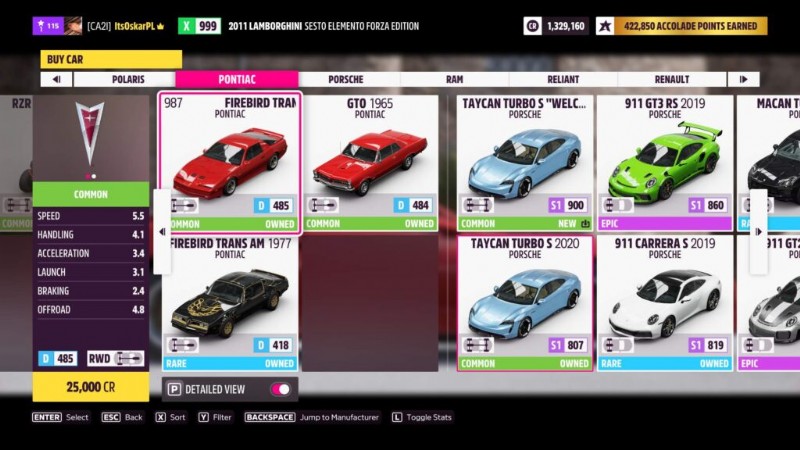 オートショーに行き、Firebird Trans AM GTA 1987 を見つけます。ボタンを押して製造元にジャンプし、Pontiac を見つけるか、Firebird 1987 が見つかるまでスクロールします。この車を見つけたら、わずか 25,000CR で購入できます。はとても安いです。