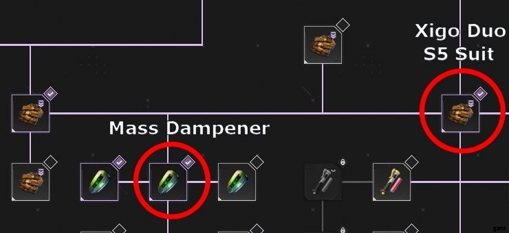 - ワークショップのマス ダンパー モジュール x 2 (スーツ モジュール スロットが 2 つある Xigo “Duo” S5 Envirosuit が少なくとも必要です)。毎回ドロップするときは、その時間を使ってマスダンパーモジュールを装備してください。速度が 10% 向上 (ダンパーごとに 5%)
