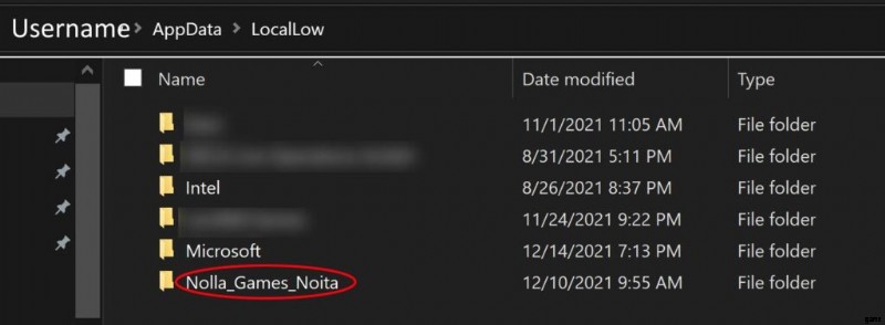 - 次に LocalLow をクリックし、次に Nolla_Games_Noita をクリックします。