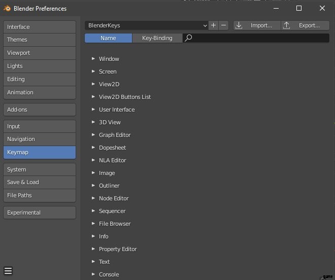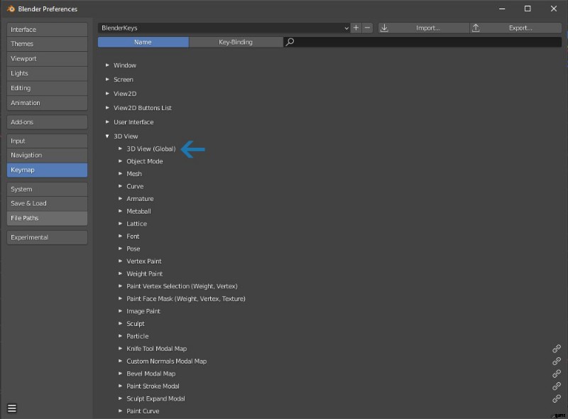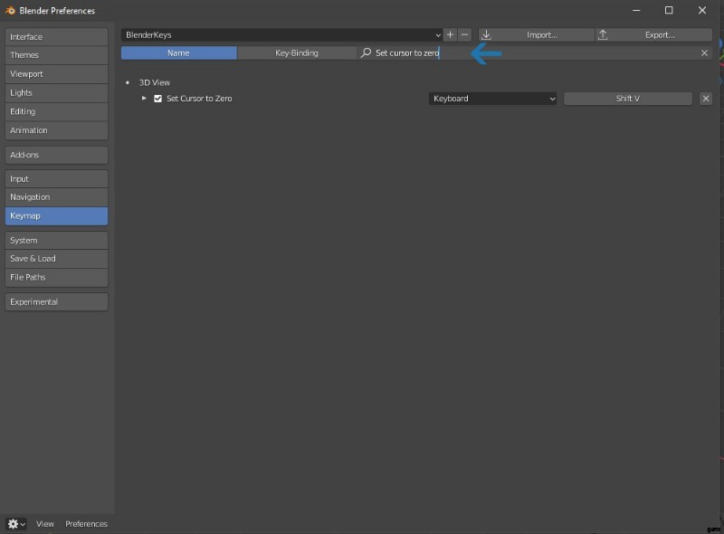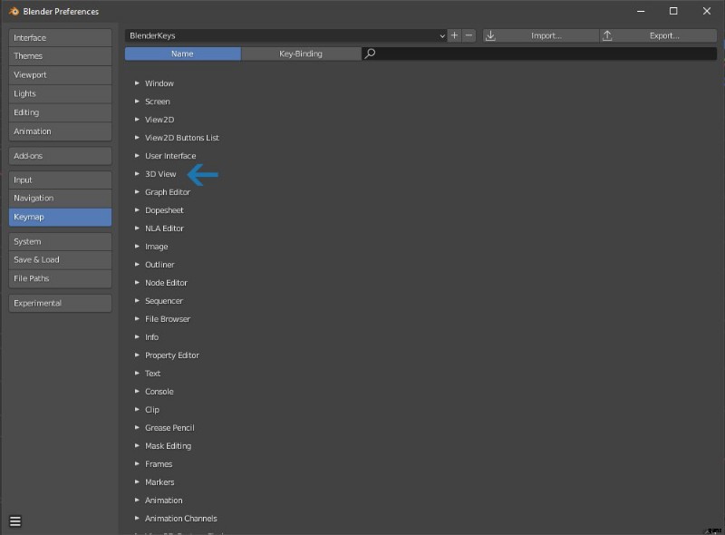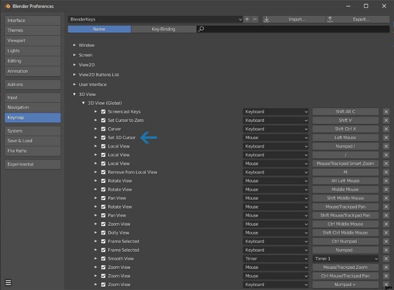 3D カーソルが動かないようにするには、環境設定 (CTRL + ALT + U) を開き、左側のメニューで [キーマップ] を選択します。