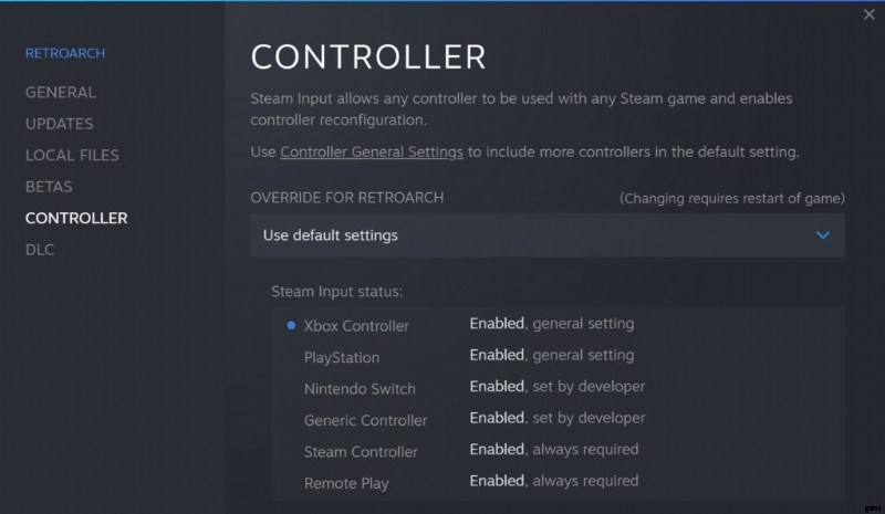 多くの場合、RetroArch の Steam バージョン (またはスタンドアローン バージョンを非 Steam ゲームとして追加) のデフォルトでは、Steam コントローラのサポートがクライアントでグローバルに有効になっている場合、デフォルトのラッパー設定を使用して、特定のコントローラが Xbox 360 を模倣できるようにします。多くの PC ゲームや一部のエミュレーターは、一般的にコントローラーのサポートに XInput を使用します。