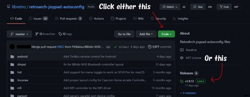 Steam バージョンの RetroArch を使用している場合は、非 Steam バージョンの RetroArch からダウンロードしたコントローラ プロファイルを転送して、Steam バージョンにインポートできます。リリース ページに移動して、安定版リリースのプロファイルのソース コード (zip) リンクをクリックするか、緑色の [コード] ボタンをクリックして、フロントページ: