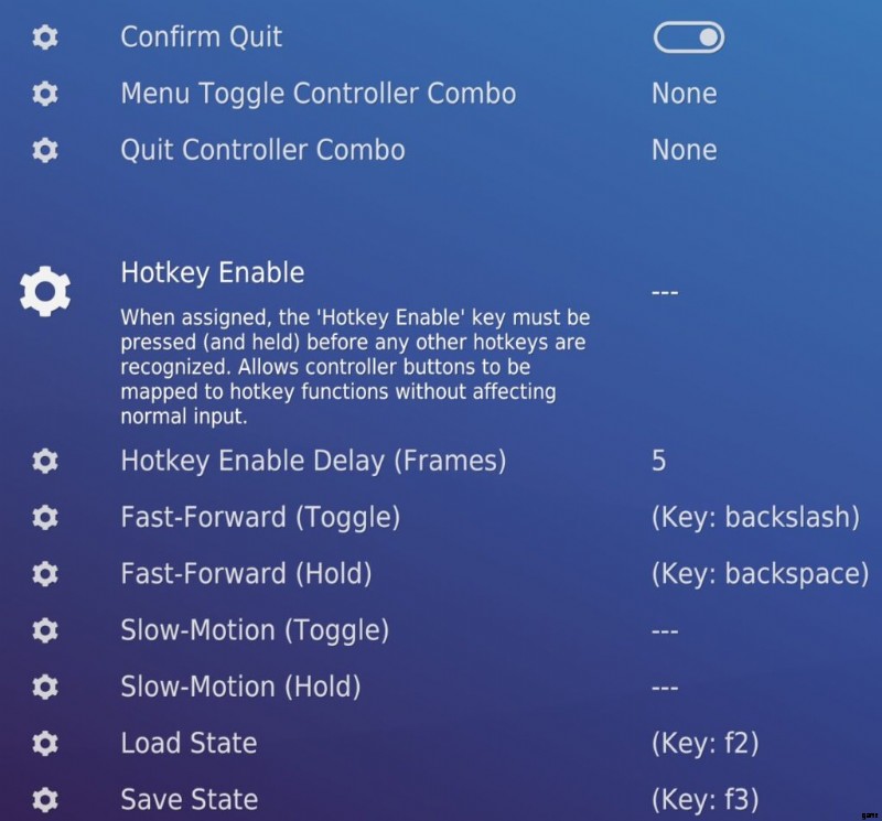 キーボード ショートカットを使用する場合、残念ながら、キーボードでホットキー機能を使用するには、ホットキー有効化に割り当てられているボタンを使用する必要があります。 RetroArch の開発者が、キーボードとコントローラーの 1 つだけにホットキーの有効化ボタン バインドがある場合に、両方に影響を与えるような問題を作成しないことを望みます。このため、キーボードのホットキー有効化として機能する、簡単にアクセスできるキーを作成することもお勧めします。この RetroArch の問題が不便な場合は、この問題が解決しない限り、このガイドの残りの部分に従わないでください。