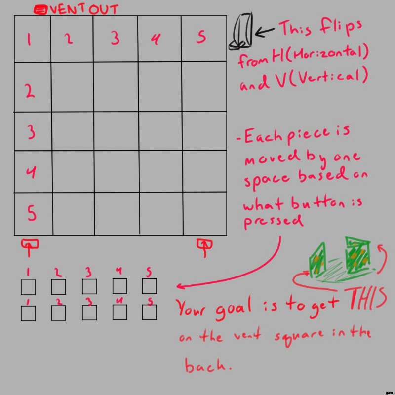 これが示しているのは、部屋がどのようにレイアウトされているか、目的の場所 (上部の通気口)、ボタンのシャッフルがどのように機能し、何が動くかです。