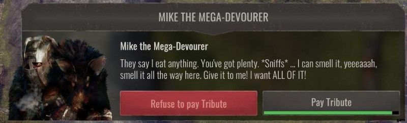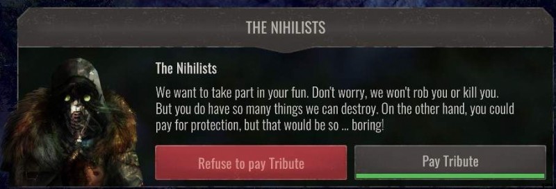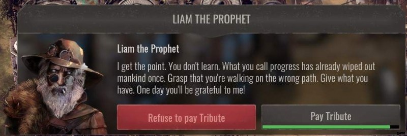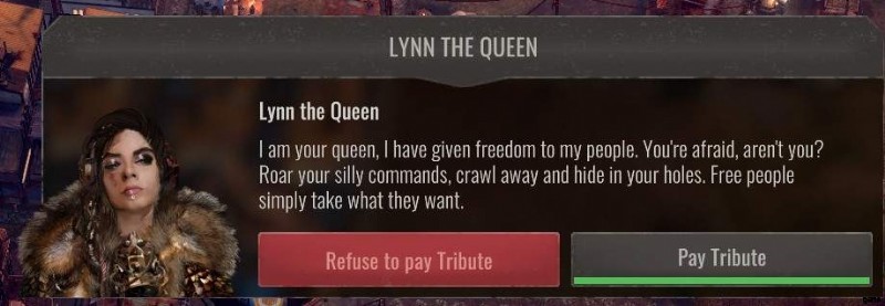 あなたが対話しなければならない5人のレイダーがいて、それぞれが資源の貢ぎ物を支払うか、彼らと戦うかを尋ねます.この実績を達成するには、セッション/実行で 1 回、それぞれに敬意を払う必要があります。 1 人の貢ぎ物を支払ったら、その人をなだめ続ける必要はなく、支払いを拒否することができます。かなり単純ですが、主に時間の浪費のために、実際に取得するのは非常に困難です。実績を直接探しながら、約 200 シーズンのゲームに参加しました。しかし、残業時間がひどいものにならないようにするためにできることがいくつかあります。