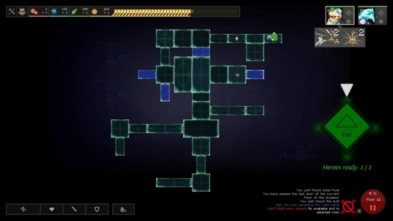 - Cheeky Doors: If you accidentally find the exit early, and you want to leave because you have a lot of dark rooms, but you just build your majors and you want to get some more resources before leaving, you can open some cheeky doors. Basically, just set things up as best you can, and have 1 or both of your heroes open some nearby doors in quick succession, before popping the crystal and running away. You don’t need to clear all the waves before you open the next door. You can do some pretty risky stuff this way, including opening some doors then quickly redirecting the power before lifting the crystal. Just remember once the crystal is on the move you cannot power any rooms.