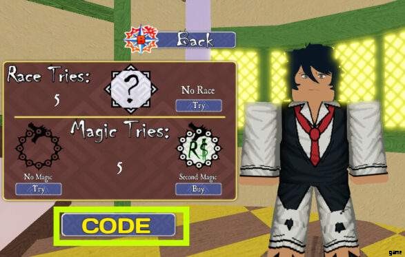 カスタマイズ メニューに移動し、Race &Magic をクリックして、Race Tries &Magic Tries (左下隅) の下にコードを入力します。