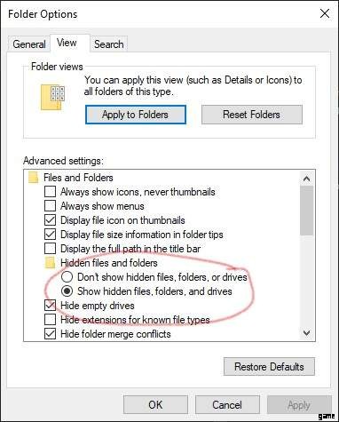 開いたウィンドウで [表示] タブを選択し、スクリーンショットで強調表示されているオプションを [隠しファイル、フォルダー、およびドライバーを表示する] に変更します。