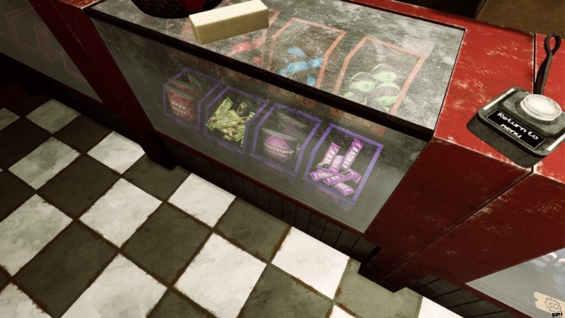 紫色のがっかりチップが置かれているプライズ カウンターの内部。