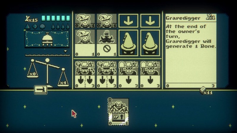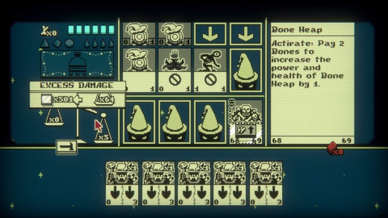 - 手札に残るのは、追加の Gravediggers と Boneheap だけです。 Gravediggers は骨が必要なので、この時点ではプレイしません。 (ハンマーを使うと骨が 1 つ戻ってきますが、骨の数に影響するのは損益分岐点だけです。面倒なことは省いてください。)