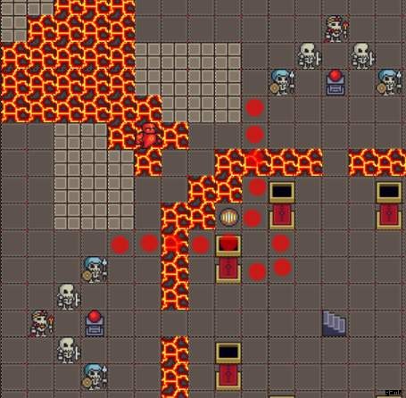 This is the floor that looks like this:This is the floor that’s most likely to kill you even with cautious play, because how it works is very spoilery. A common death on this floor looks like this:‘walk to a side, see some skeletons, aggro both fire elementals in the corners, start to get overwhelmed, aggro the rest of the floor, try to take the stairs, die in one turn’. Instead, do the following, which relies on a precise understanding of how aggro works: