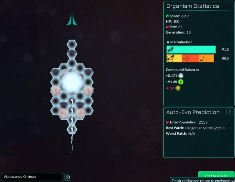 とても厳しい。捕食者は、他の細胞を消費することでリソースを取得します。そのため、単一および二重の膜を持つ細胞のみが捕食者になることができます.あなたが他の人を消費するのに十分な大きさであり、捕食を実行可能にするために食事の間に十分長く生き残ることができるようになるまで到達することは困難です.最終的には、空胞と鞭毛への投資を開始して、キルからより多くの食料を保存し、狩猟能力を高めることができます.下の写真の私の現在の細胞は二重膜、4 つの鞭毛、4 つのケモプラスト、5 つのミトコンドリアを持っており、これまでのところ非常にうまく機能しています.