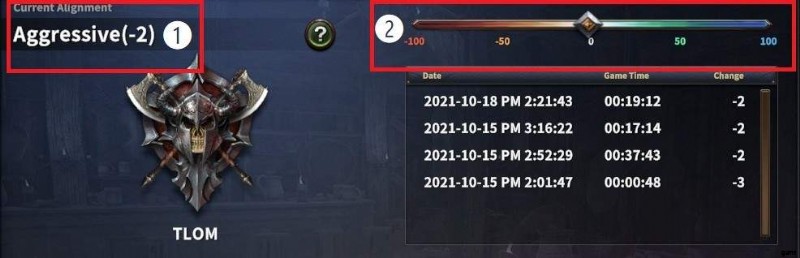あなたのゲームプレイ スタイルは、キャラクターの名前の色で表されます。赤に近い場合、アラインメントがアグレッシブに近いことを示します。青の場合、あなたの属性は友好的です。