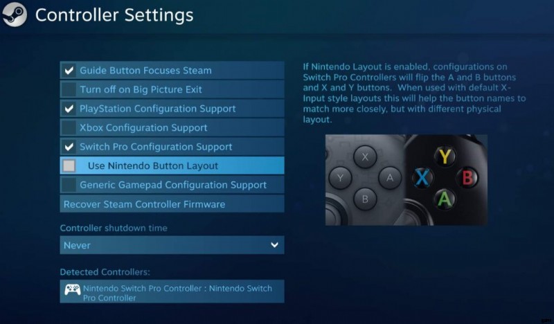 この代替手段はフォーラムで提案されていますが、ゲーム固有のものではないため、私は好きではありません.モンスター ハンター ライズのキーを具体的に再マッピングする代わりに、Steam が Nintendo Switch Pro コントローラーを処理する方法のデフォルト設定を変更できます。ここで正しく動作しない Steam の特別な機能があるようです (ただし、他のゲームでは正常に動作します)。この機能をオフにすると、キーを再マッピングするのと同じ効果が得られます。