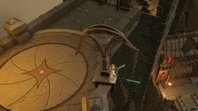 - Ulgar に降りる階段の左側にある上の階へのはしごを見つけ、通路をたどってレバーに向かいます。