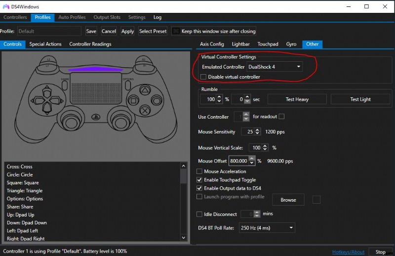 次に、そこからその他に移動し、エミュレートされたコントローラーが Xbox 360 コントローラーではなく、Dualshock 4 コントローラーであることを確認して、変更を適用して保存します。