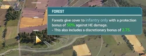 - 森林被覆: 歩兵分隊が森にいる場合、50% のカバー ボーナスの恩恵を受けます。つまり、ユニットはダメージが 50% 減少するというメリットがあります。