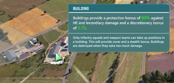 - 建物カバー: 歩兵分隊が建物内にいる場合、被ダメージが 90% 減少します。