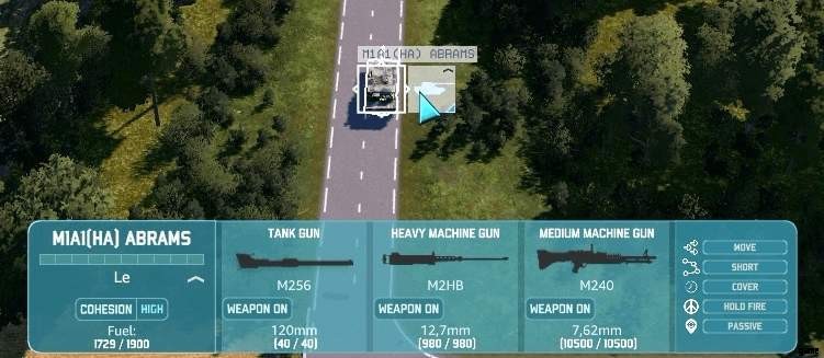 このパネルには、選択したユニットの重要な情報が表示されます。左から右に、ユニットの種類、ステータス、クルーと結束レベル、燃料負荷を表示できます。装備している武器、ステータス、弾薬数が次に表示されます。右側には、ユニットが戦場でどのように振る舞うべきかを切り替えることができるさまざまなオプションがあります.