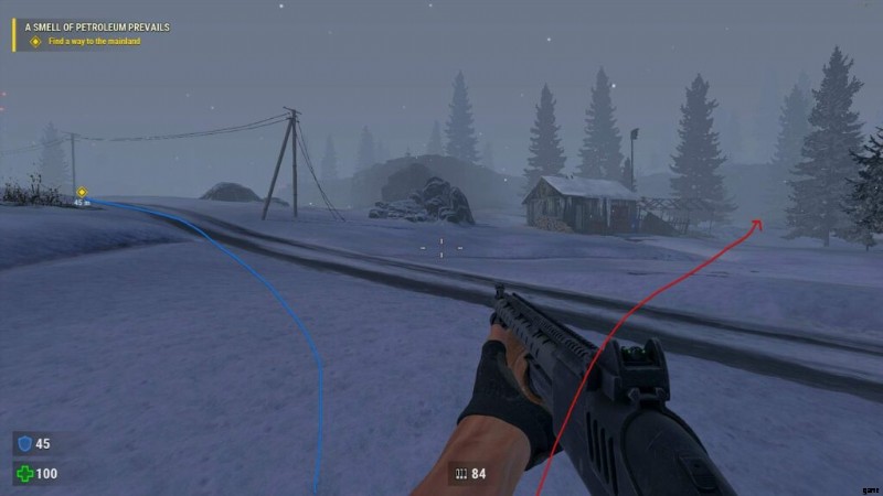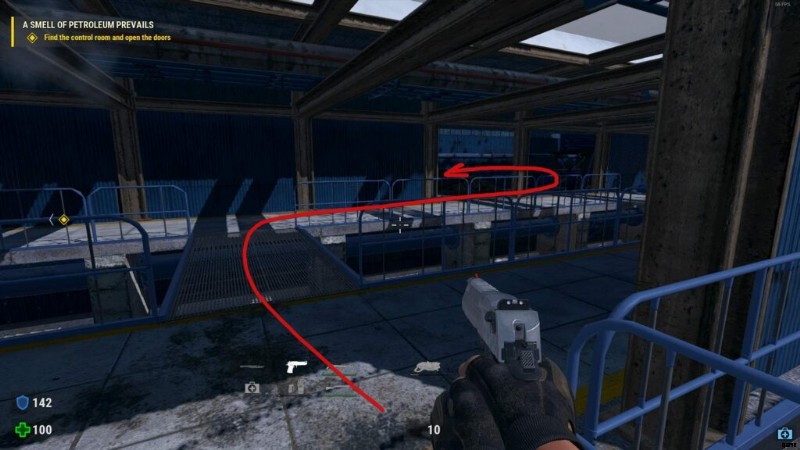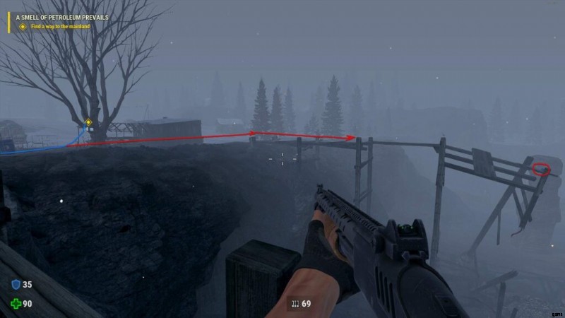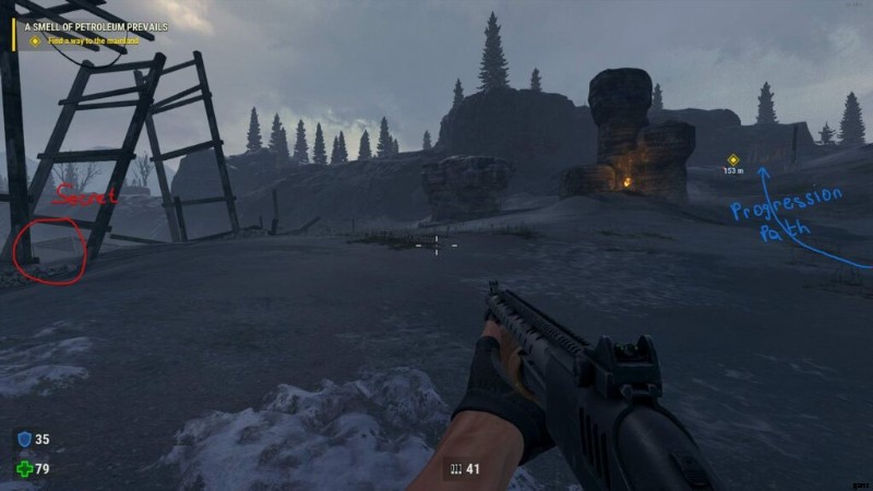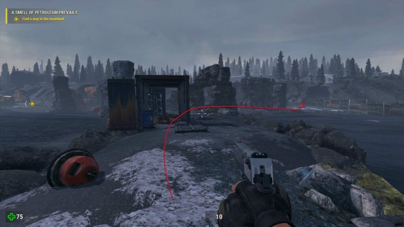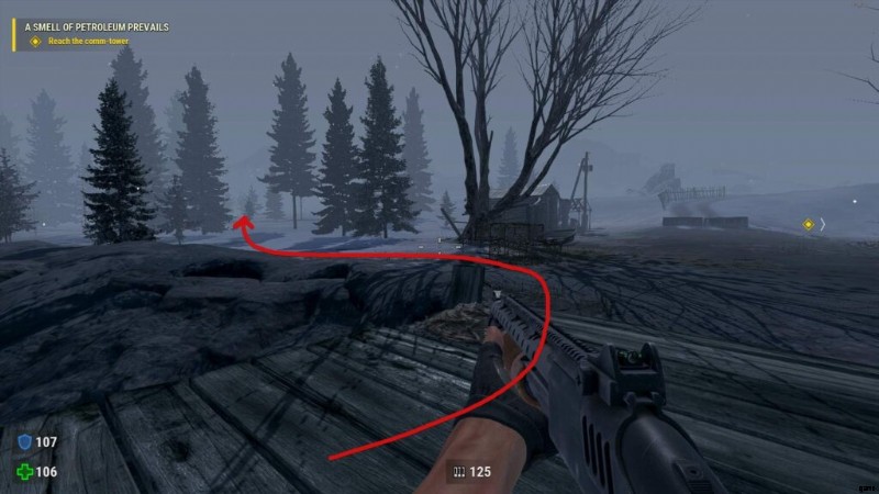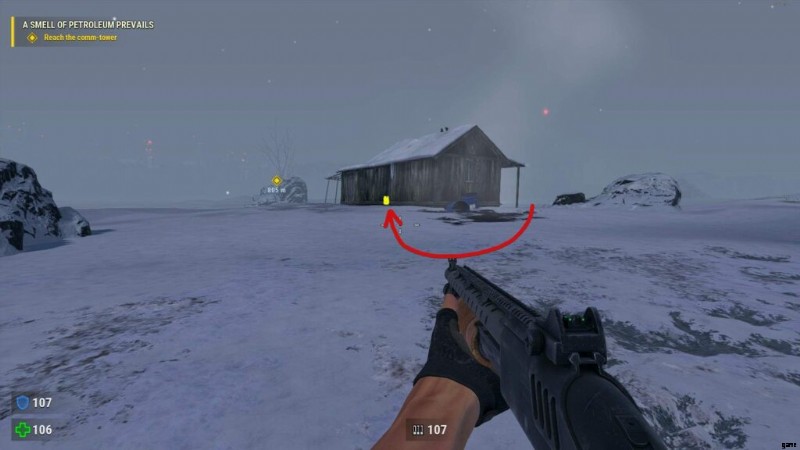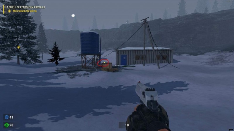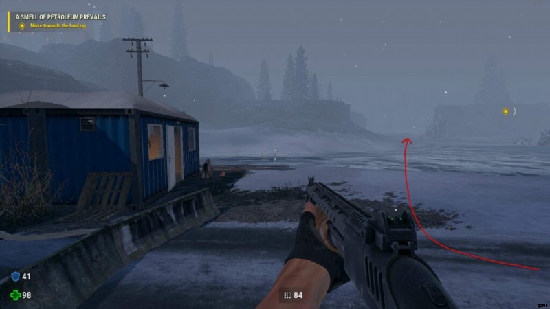 最初の石油リグ道路の分岐点の近くで、右側の道をたどって青い小屋に向かい、敵に対処し、峡谷の終わりまで右側に進みます。