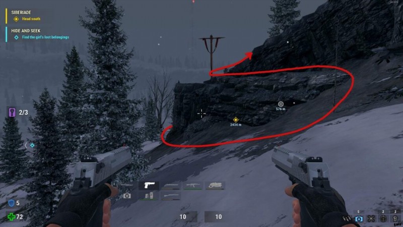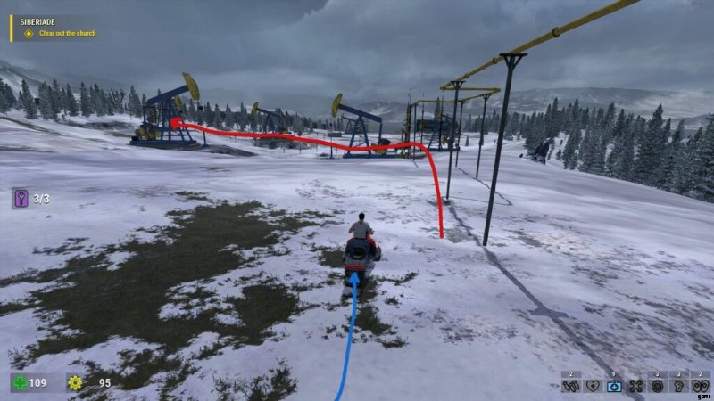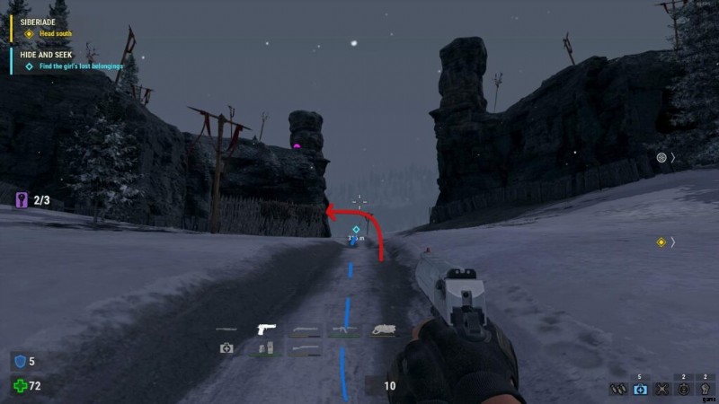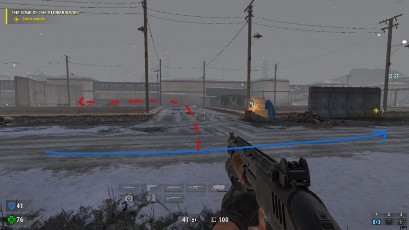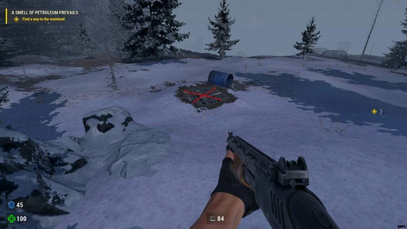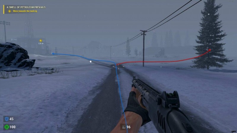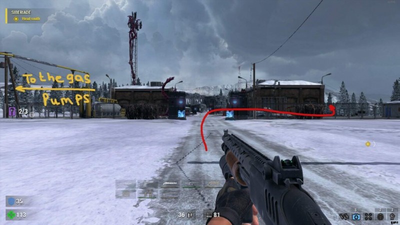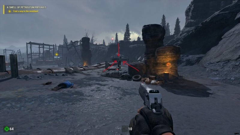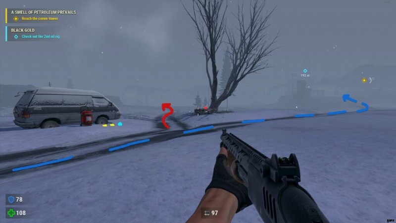 最初の石油リグ道路の分岐点の近くで、右側の道をたどって青い小屋に向かい、敵に対処し、峡谷の終わりまで右側に進みます。