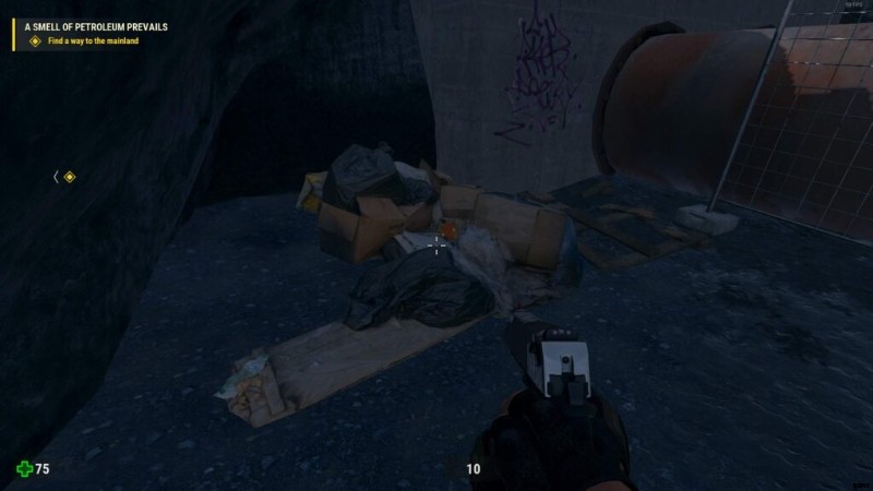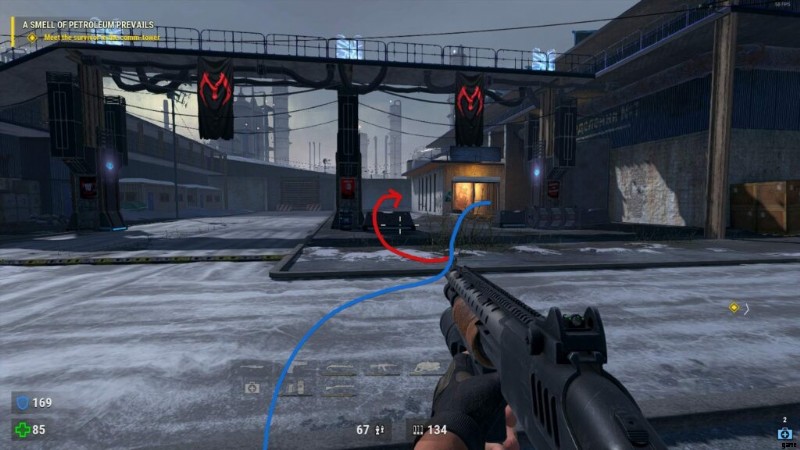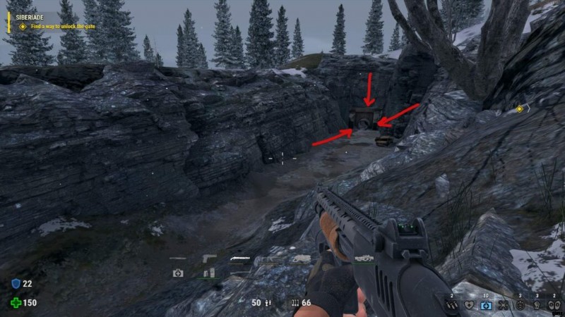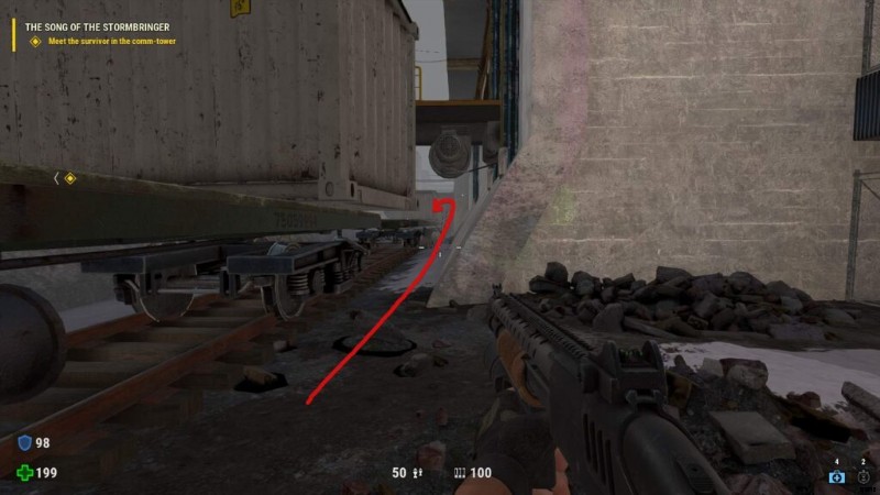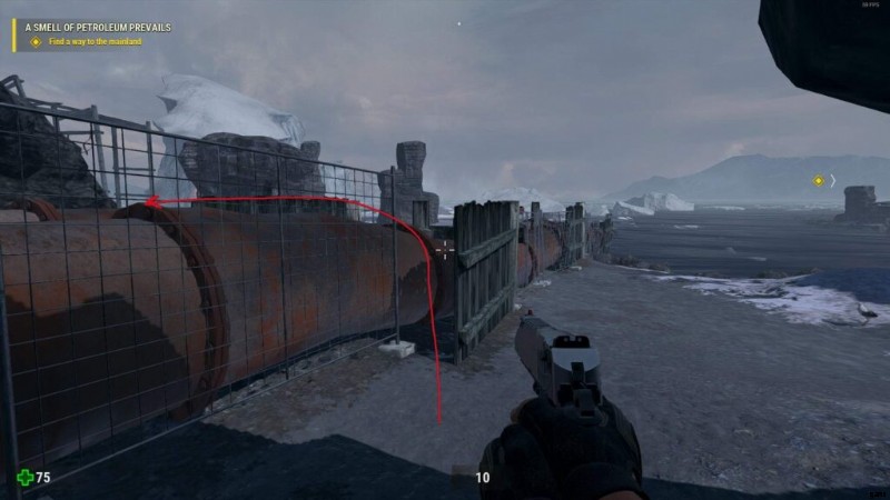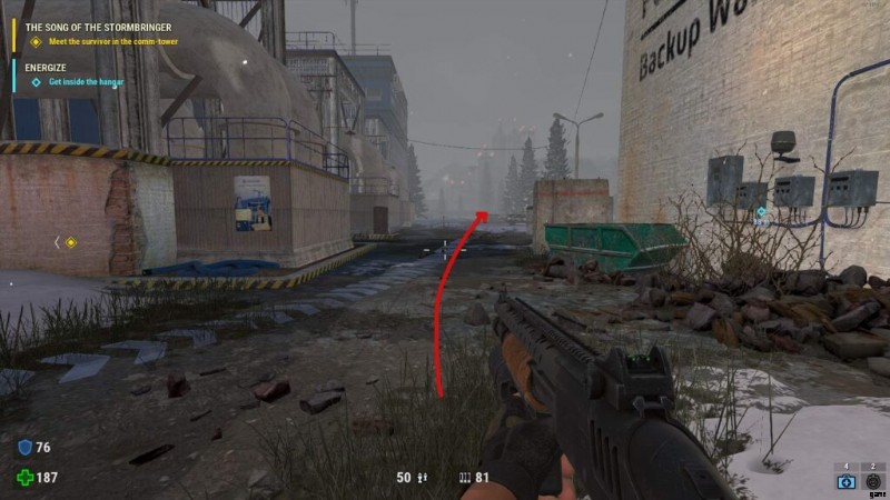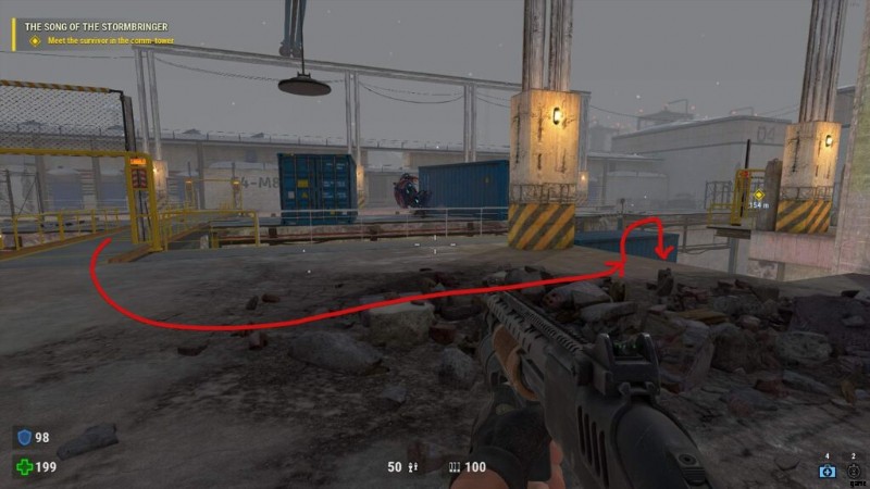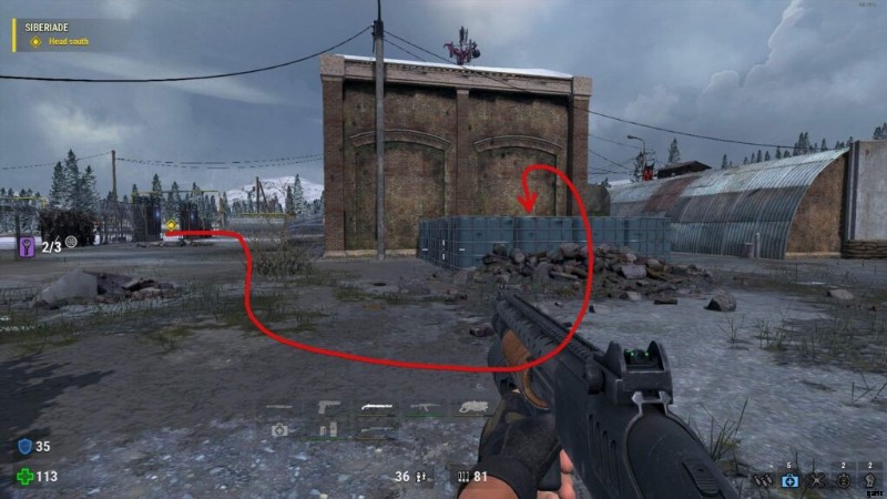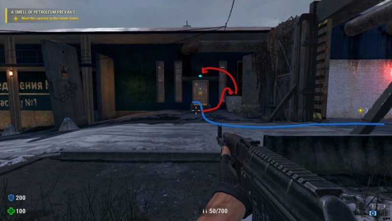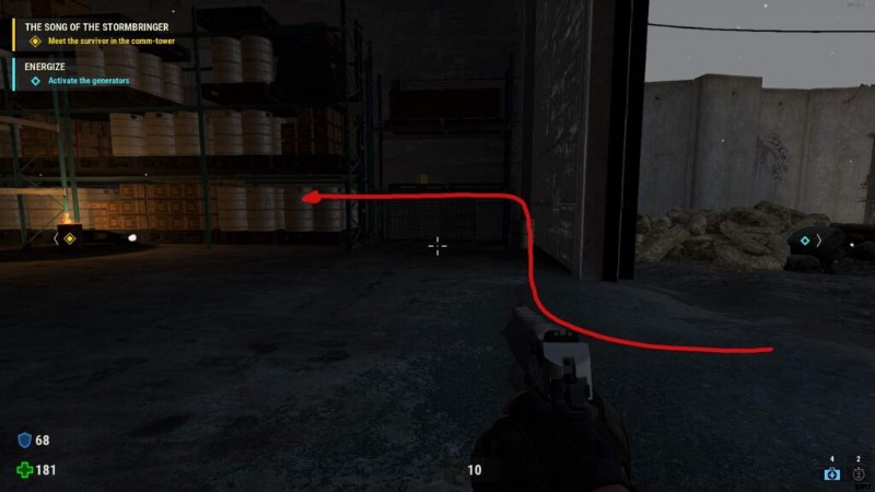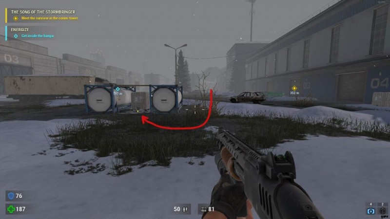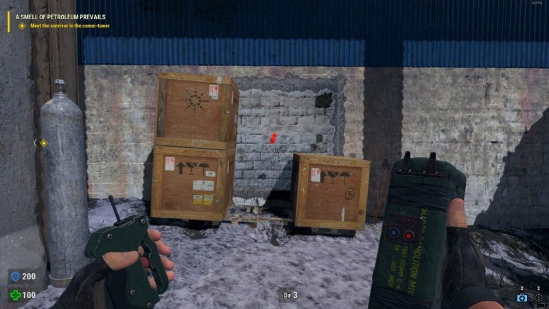 In the aforementioned big outpost with a keycard, go behind the building on the right and jump into a group of cube barrels.