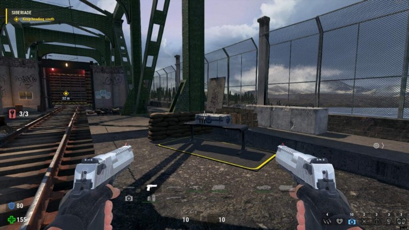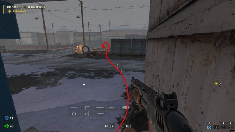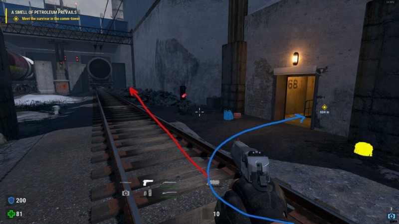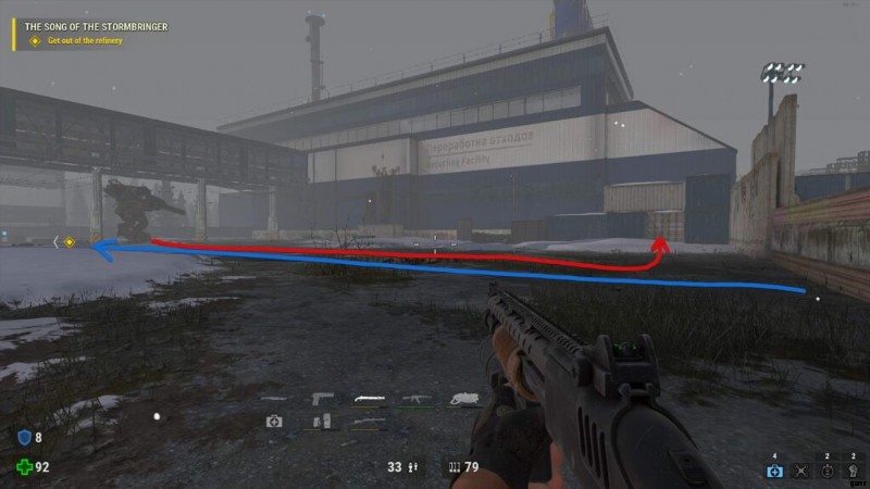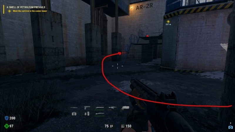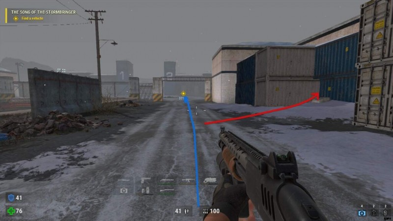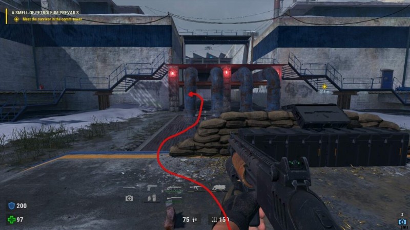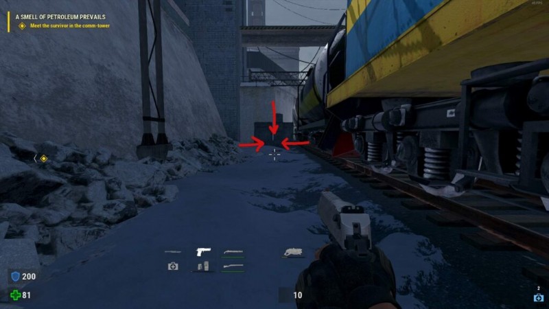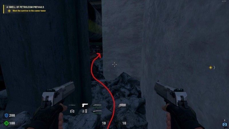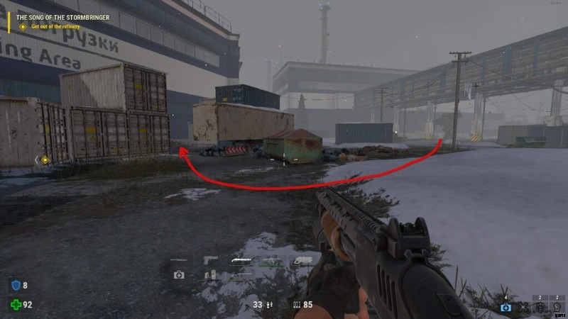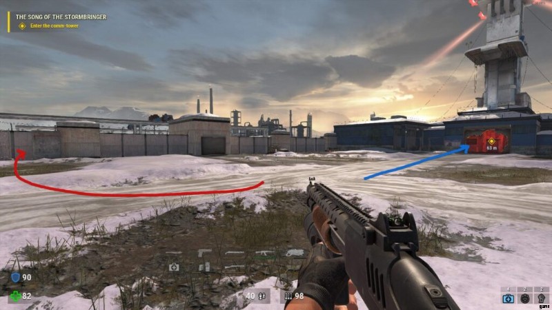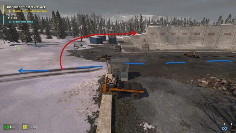 In the aforementioned big outpost with a keycard, go behind the building on the right and jump into a group of cube barrels.