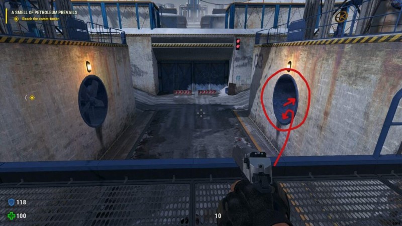 レベルの少し後になると、グナーのグループが換気シャフトから飛び出します。その中にはもうひとつの秘密があります。穴に飛び込む必要があるキャットウォークまで道をたどってください。この穴は、そこに立つことができないように作られているように見えるため、おそらく数回の試行が必要です。スライドして出ないように飛び込む必要があります。この秘密には、おそらくセキュリティ警告が必要です笑。終了するまでに、最初の L.I.F.E. を獲得できます。