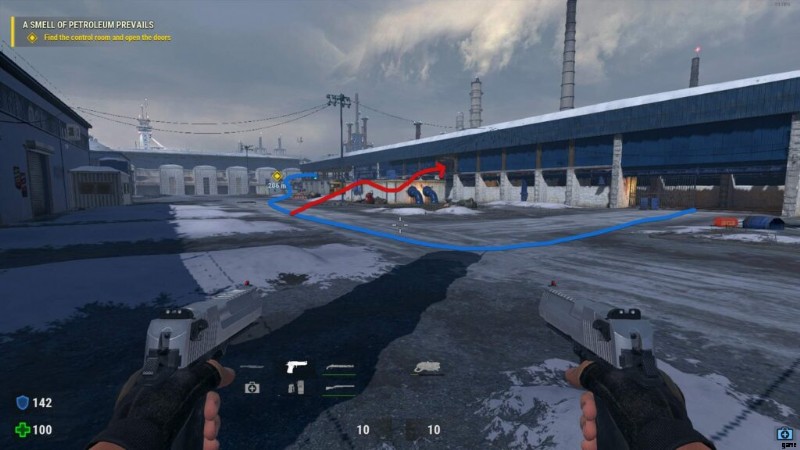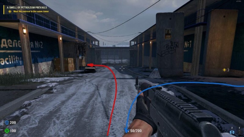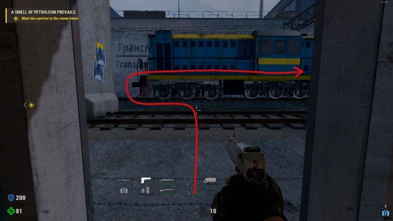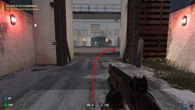 ジャンプルームの出口から、左側はレベルからの出口です。まだそこには行かず、代わりに右側のパスをたどります。最後に、壁のそばのいくつかのボックスで、ボックスを壊します。背後 – C4 のスポット。自明です。