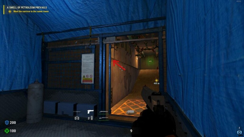 ショットガンを拾った後、上り坂の道をたどるのではなく、ビーチの端まで歩いて輸送用コンテナに入ります。ヘルス ポップを拾うと、グナーが前後に出現します。